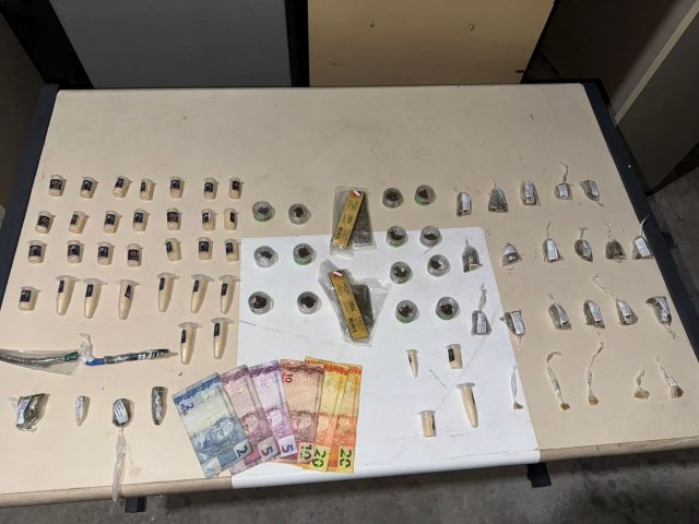 Segundo a Polícia Militar, com ele foram apreendidos 33 pinos de cocaína, 24 trouxas de maconha, 14 sacolés de haxixe, cinco pedras de crack e R$ 62.
