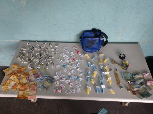 Com ele foram apreendidos 47 pedras de crack, 21 pinos de cocaína, três tiras de maconha e R$ 140. Próximo ao suspeito os policiais encontraram uma sacola contendo outros 41 pinos de cocaína. No momento desta publicação, não havia informações se o rapaz havia ficado preso. (Foto: PM/Divulgação)