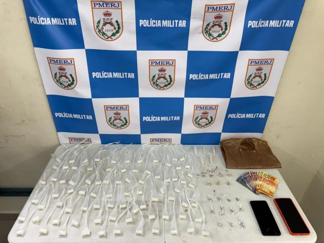 Segundo a Polícia Militar, ele foi flagrado vendendo entorpecentes a um usuário. Foram apreendidos tubos de cocaína, pedras de crack, dinheiro e dois celulares. Os dois foram conduzidos para a delegacia e no momento desta publicação não havia informações sobre o desfecho da ocorrência. (Foto: PM/Divulgação)